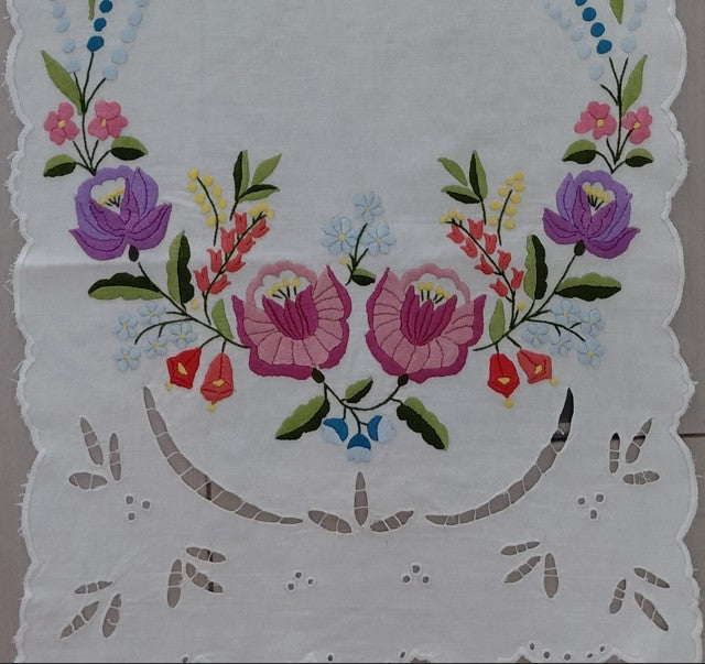Φιλοτεχνημένο πάνω σε λευκό βαμβακερό ύφασμα, αναδεικνύει την παραδοσιακή τεχνική του «κοφτού» με λεπτή λευκή κλωστή. Το περίτεχνο λευκό φεστόνι περιβάλλει τα παστέλ μοτίβα, δημιουργώντας μια αίσθηση γαλήνης και κλασικής πολυτέλειας.